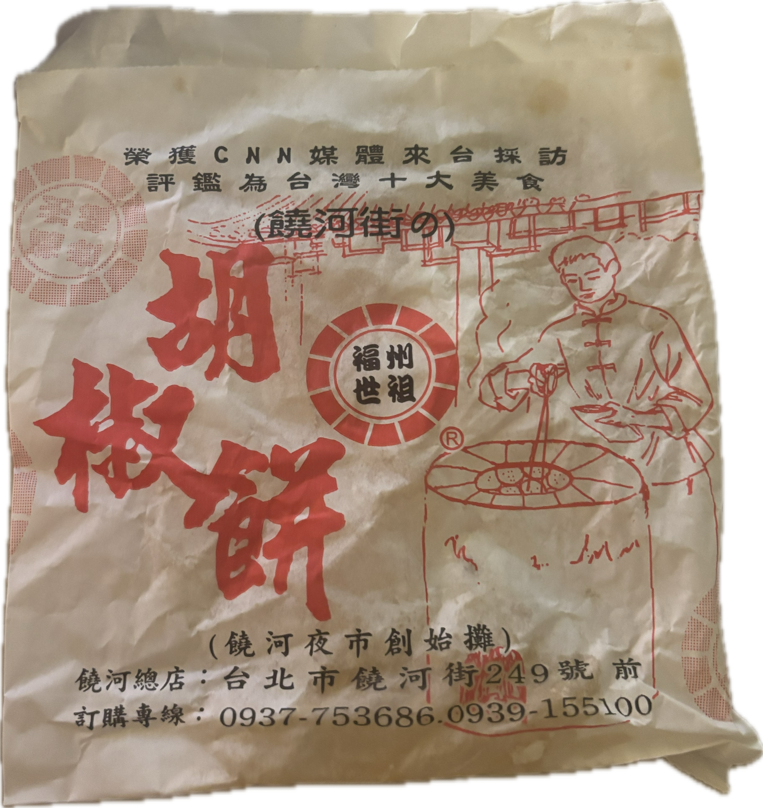 在饶河夜市吃到的美味胡椒饼!刚烤出来的时候外边面皮酥脆,里边面皮有嚼劲,肉调味美妙口感好,由于过于美味只留下纸袋遗照一张